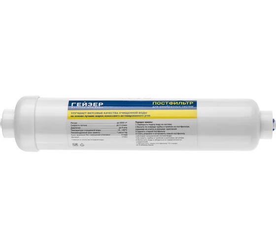Постфильтр угольный Гейзер 27093 используется для заключительной очистки воды в системах обратного осмоса Гейзер-Престиж. Изготовлен на основе прессованного кокосового активированного угля. Постфильтр удаляет неприятные запахи, которые могут возникнуть, например, при длительном хранении воды, улучшая при этом ее цвет и вкусовые качества. Температура очищаемой воды 4-40 °С.