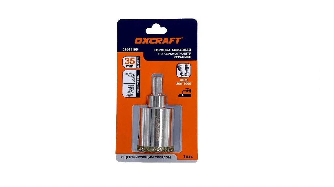 Коронка алмазная по керамограниту и керамике с центрирующим сверлом OXCRAFT 35 мм используется совместно с дрелью для сверления отверстий в кафеле, стекле, в изделиях из керамики и керамогранита. Максимальная глубина сверления: 40 мм; с центральным сверлом по стеклу; для сверления керамики; диаметр. 9,5 мм круглый хвостовик с 3 кромками; высота режущей кромки 6 мм; лазерная печать логотипа и размера на корпусе.