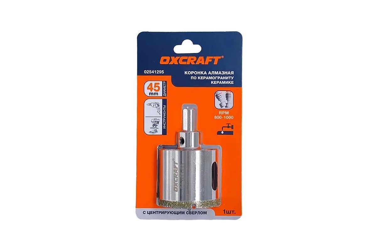 Коронка алмазная по керамограниту и керамике с центрирующим сверлом OXCRAFT 45 мм используется совместно с дрелью для сверления отверстий в кафеле, стекле, в изделиях из керамики и керамогранита. Максимальная глубина сверления: 40 мм; с центральным сверлом по стеклу; для сверления керамики; диаметр. 9,5 мм круглый хвостовик с 3 кромками; высота режущей кромки 6 мм; лазерная печать логотипа и размера на корпусе.