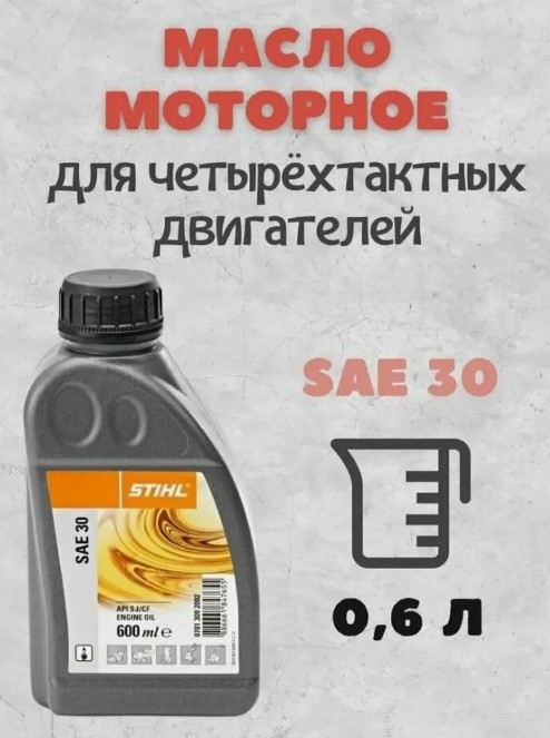 Моторное масло STIHL SAE 30 объёмом 0,6 л предназначено для четырёхтактных двигателей садовой техники. Его используют в оборудовании, включая: бензиновые газонокосилки; бензиновые культиваторы; бензиновые подметальные машины; бензиновые виброплиты; бензиновые генераторы; бензиновые мотопомпы. Масло разработано для тяжёлых условий эксплуатации, содержит высококачественные базовые масла и присадки, которые обеспечивают безупречную смазку и снижают расход топлива. Также масло обладает высокой смазывающей и очищающей способностью, повышает экологичность использования бензоинструмента и продлевает срок его службы.