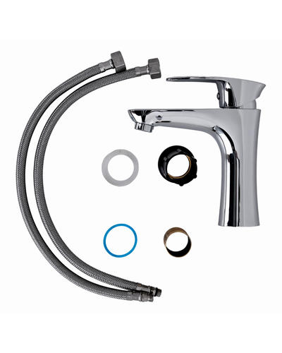 смеситель, набор креплений, гибкая подводка и инструкция