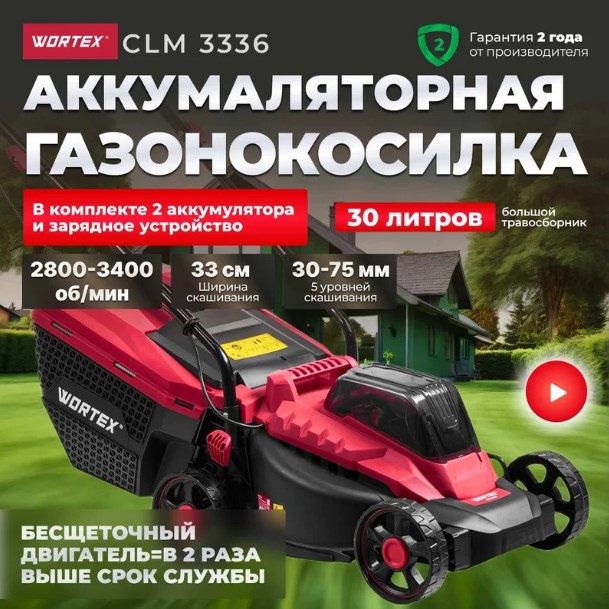 Газонокосилка аккумуляторная WORTEX CLM 3336 ALL1 XLT SET предназначена для покоса травы на ландшафте путём среза растительности на заданную пользователем высоту. С её помощью можно быстро и качественно преобразить приусадебный участок. Некоторые характеристики модели: Заряд батареи хватает на обработку участка площадью до 200 м². Время непрерывной работы — 40 минут. Регулировка высоты — 5 позиций (30, 40, 50, 60, 75 мм). Объём травосборника — 30 л. Передвижение — несамоходное. Тип режущей гарнитуры — роторный нож. Материал деки — пластик. Материал колёс — пластик. Диаметр передних колёс — 140 мм, задних — также 140 мм. Вес нетто — 7,2 кг.