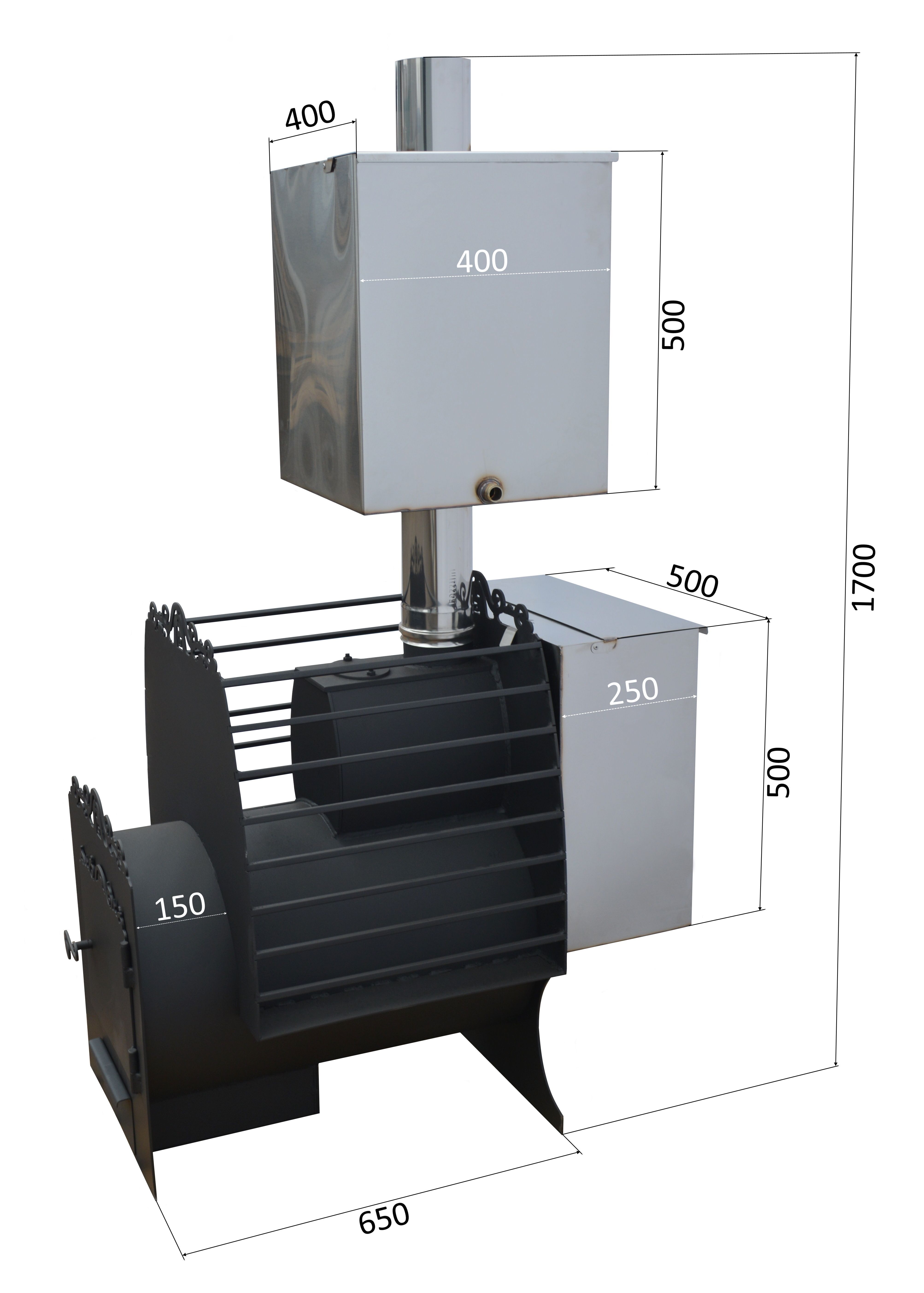 Состоит из двух блоков: цельносварной топки-каменки и бака для горячей воды (бак приобретается отдельно)