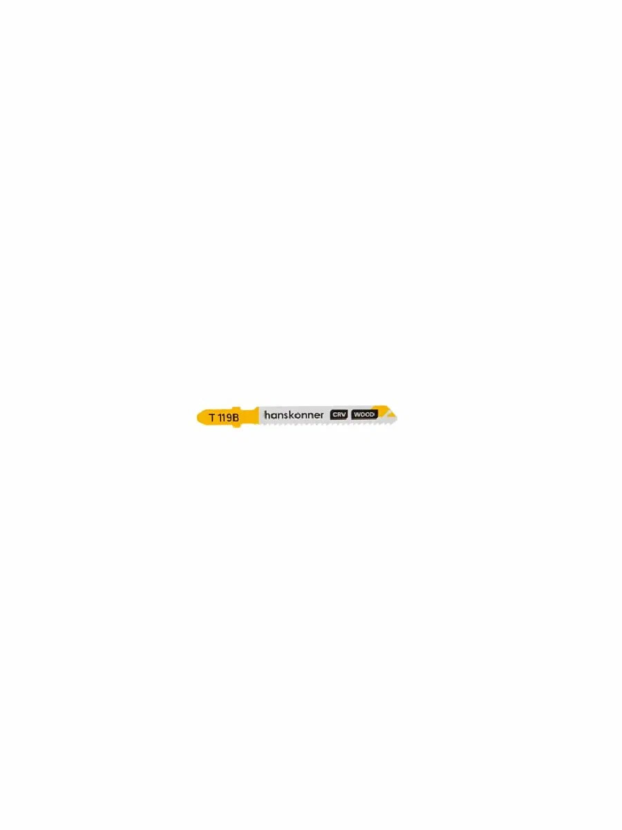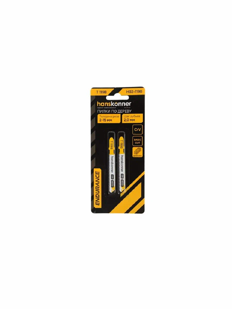 Пилки для лобзика Hanskonner H02-119B - Предназначены для прямых пропилов в мягкой и твердой древесине толщиной 2-15 мм. CrV- изготовлены из хромованадиевой стали, обладают высокой прочностью и ресурсом. AUTO - автоматическая заточка и шлифовка на высокоточном оборудовании. Характеристики: Длина полотна: 76 мм. Шаг зубьев: 2. Материал: HCS. Исполнение зуба: Фрезерованные разведенные. Рабочая длина: 50 мм. Обрабатываемый материал: Дерево 2-15мм. Тип пилки: T119B. Комплектация: Пилки - 2 шт.