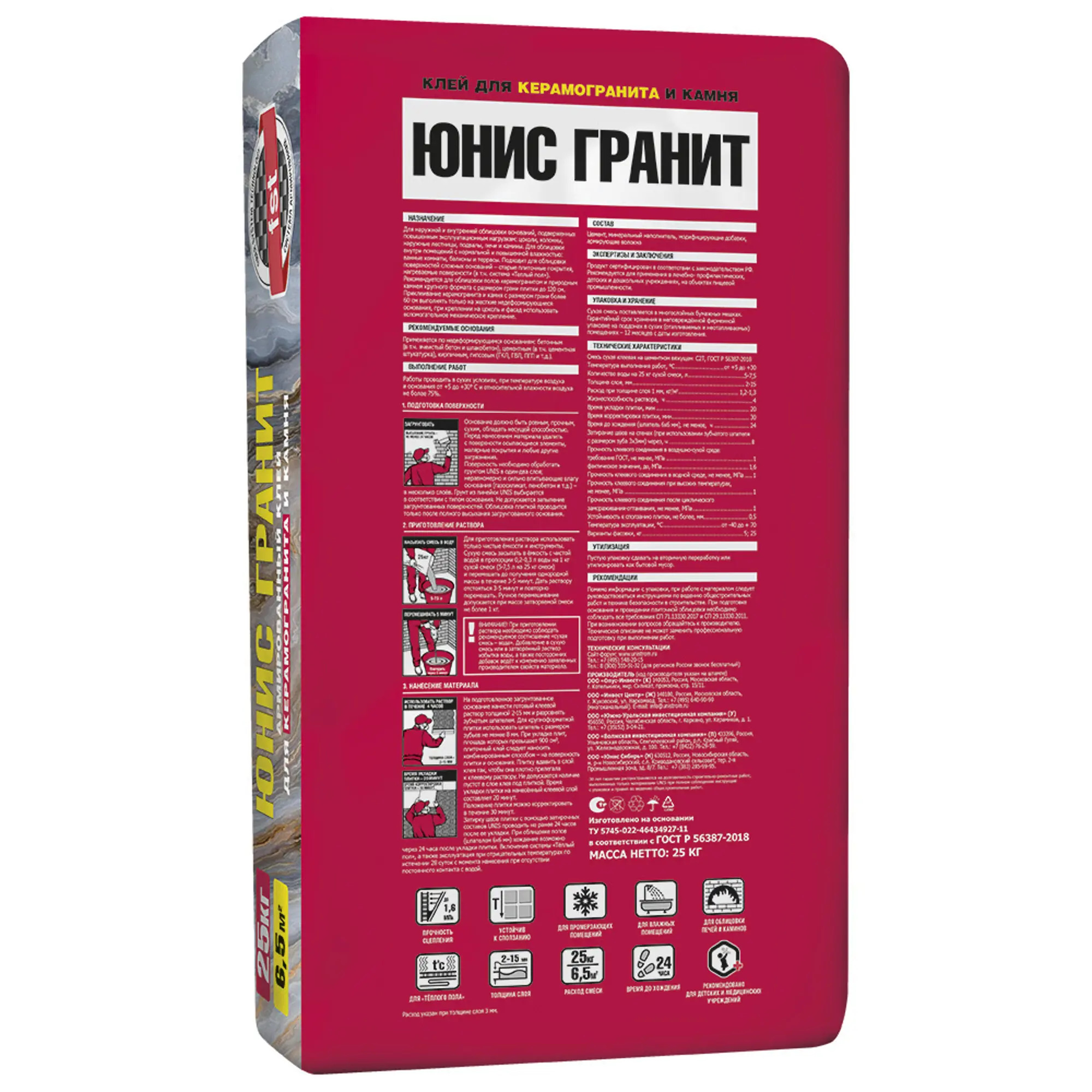 Клей для плитки Unis C2T предназначен для наружной и внутренней облицовки оснований, подверженных повышенным эксплуатационным нагрузкам: цоколи, колонны, наружные лестницы, подвалы, печи и камины. Для облицовки внутри помещений с нормальной и повышенной влажностью: ванные комнаты, балконы и террасы. Подходит для облицовки поверхностей сложных оснований – старые плиточные покрытия, нагреваемые поверхности (в т.ч. система «Теплый пол»). Рекомендуется для облицовки полов керамогранитом и природным камнем крупного формата с размером грани плитки до 120 см. Приклеивание керамогранита и камня с размером грани более 60 см выполнять только на жесткие недеформирующиеся основания, при креплении на цоколь и фасад использовать вспомогательное механическое крепление. При производстве применяется система армирования FST (Fiber System Technology) - это уникальная система армирующих волокон, которая в зависимости от типа состава и выполняемых задач, подбирается индивидуально. Армирующие волокна позволяют снизить риск образования трещин в материале на этапах твердения и эксплуатации. Армированные продукты идеальное решение: для новостроек, подверженных осадке; для строений, находящихся рядом с магистралями и другими местами с усиленной вибрационной нагрузкой. Температура выполнения работ - от +5 до +30 °С Температура эксплуатации - от -40 до +70 °С