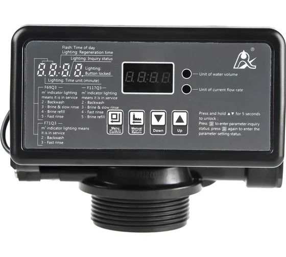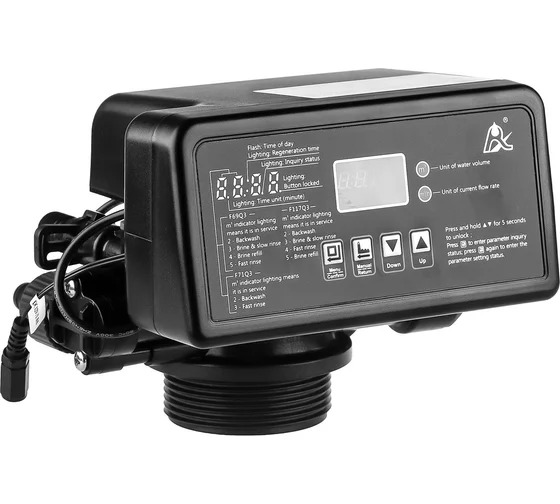 Блок Runxin f117q3 для умягчения по расходу 3/4" 36568 предназначен для управления процессом фильтрации, регенерации, обратной промывки фильтрующей загрузки и другими режимами работы умягчителя колонного типа, использующего для регенерации реагенты.