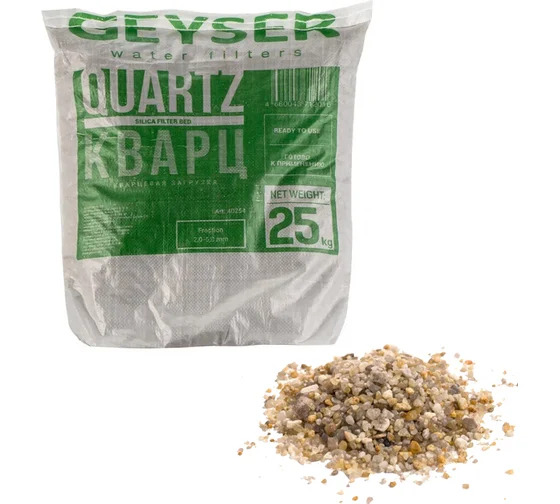 Окатанный кварц Гейзер 2-5 мм, мешок 25 кг 40201 представляет собой смесь кварцевого песка и гравия. Поставляется в мешке 25 кг. Изделие применяется в системах водоподготовки для удаления взвешенных частиц в качестве фильтрующего материала, а также в качестве поддерживающего слоя основной загрузки.