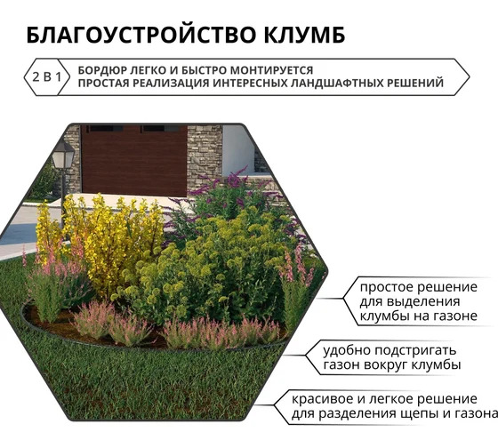 Садовый пластиковый бордюр Gidrolica 10000x20x100 мм, с отверстиями 7303 предназначен для обрамления газона, создания клумб, разграничения грядок и обрамления дорожек. Бордюр прост в монтаже и не требует подготовки траншей и фундамента. Обладает гибкостью при монтаже, подходит как для радиусной выкладки, так и для прямой. Садовый бордюр используется совместно с крепящим якорем, необходимое количество которого зависит от выкладки. Вы можете приобрести якорь отдельно в необходимом количестве, код товара 16195927.