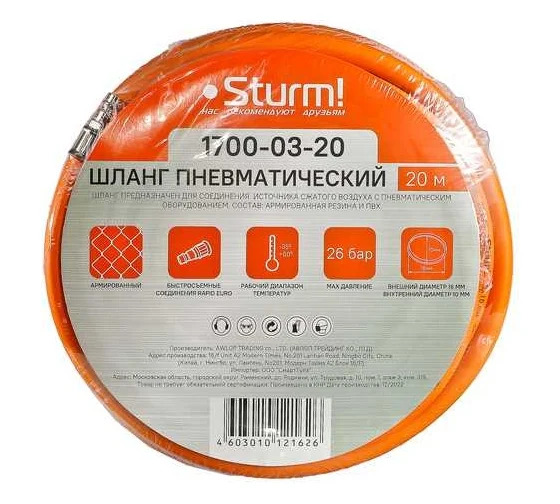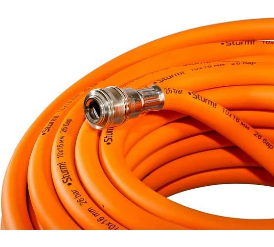 Шланг для компрессора комбинированный резиновый/ПВХ Sturm! 1700-03-20 предназначен для соединения компрессора и пневмоинструмента, служит удлинителем между компрессором и рабочим инструментом.