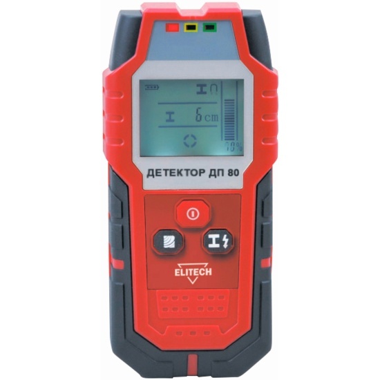 Детектор с питанием от элемента 6LR61 (9 В) предназначен для обнаружения металлов (сталей и цветных металлов), арматуры, различных проводников и проводов под напряжением, а также деревянных конструкций в стенах и перекрытиях глубиной до 80 мм и точностью ±1 см.