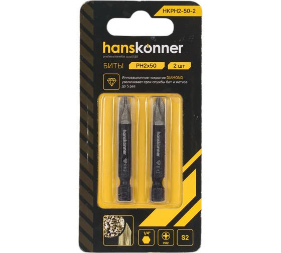 Биты PH2х50 мм, 2 шт Hanskonner HKPH2-50-2 благодаря инновационному покрытию DIAMOND вгрызаются в головку метиза, тем самым обеспечивают надежную посадку и предотвращают его выскальзывание. Гарантируют двойную защиту от деформации метиза, увеличивают передачу крутящего момента в 1,5 раза.