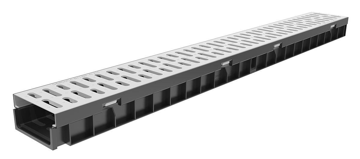 Лоток пластиковый 1000х115х58 мм с решеткой стальной штампованной, предназначен для сооружения дренажных систем и систем поверхностного водоотвода. Серия Gidrolica Light, класс нагрузки A15 (до 1,5 т). Срок службы не менее 50 лет.