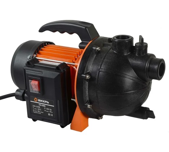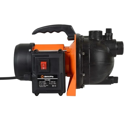 Поверхностный насос Вихрь ПН-900 будет полезен при необходимости подачи чистой воды под давлением в загородный дом, на садовый участок, небольшую ферму. Конструкция состоит из центробежного насоса и электродвигателя мощностью 900 Вт, заключенных в прочный пластиковый корпус. Производительность составляет 60 л/мин. Для удобства переноски модель имеет рукоятку. Насосная часть сделана из пластика, но патрубки на ее крышке усилены металлической резьбой, диаметры входного и выходного отверстий составляют 1 дюйм. Крыльчатка насоса изготовлена из композитного пластика и рассчитана на работу с относительно чистой водой, в которой допускаются небольшие примеси твердых частиц (до 150 г/м³). Наличие волокон, абразивных включений, химических веществ в перекачиваемой жидкости недопустимо. Поверхностный насос имеет функцию самовсасывания. Максимальная глубина, с которой он может производить забор воды, составляет 9 м. Мощности двигателя достаточно для подъема воды на высоту до 45 м, что позволяет использовать агрегат для комплектации автономной станции водоснабжения. Компактная, надежная, удобная в применении модель Вихрь ПН-900 пригодится на даче, в загородном хозяйстве для полива, орошения огорода, водоснабжения участка из местного водоема или колодца.