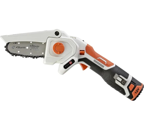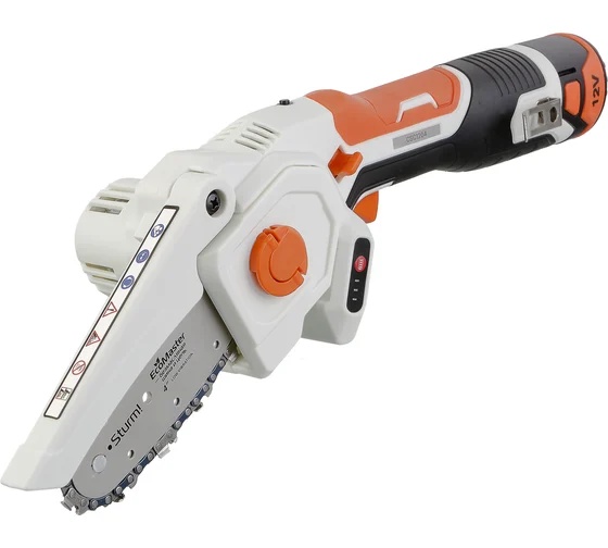 Аккумуляторная пила CSC1204 Sturm Предназначена для бытового использования. Данная модель обладает повышенной мобильностью, так как может использоваться вне зависимости от источников питания. Идеально подходит для работы в саду при уходе за растущими деревьями, распила и обрезания веток деревьев, а также справится с простыми столярными работами. Главной особенностью цепной пилы является наличие безмасляной пильной гарнитуры. Это гарантирует немало преимуществ: пила не нуждается в заправке маслом и, как следствие, в постоянном контроле его уровня, исключается необходимость регулярной прочистки маслоподающего канала от опилок, инструмент не оставляет масляные пятна при транспортировке или хранении. Откидной защитный кожух делает работу с пилой безопасной. При необходимости можно задействовать всю длину шины, кожух откидывается под углом 90°. Прорезиненная рукоятка обеспечивает надежный хват.