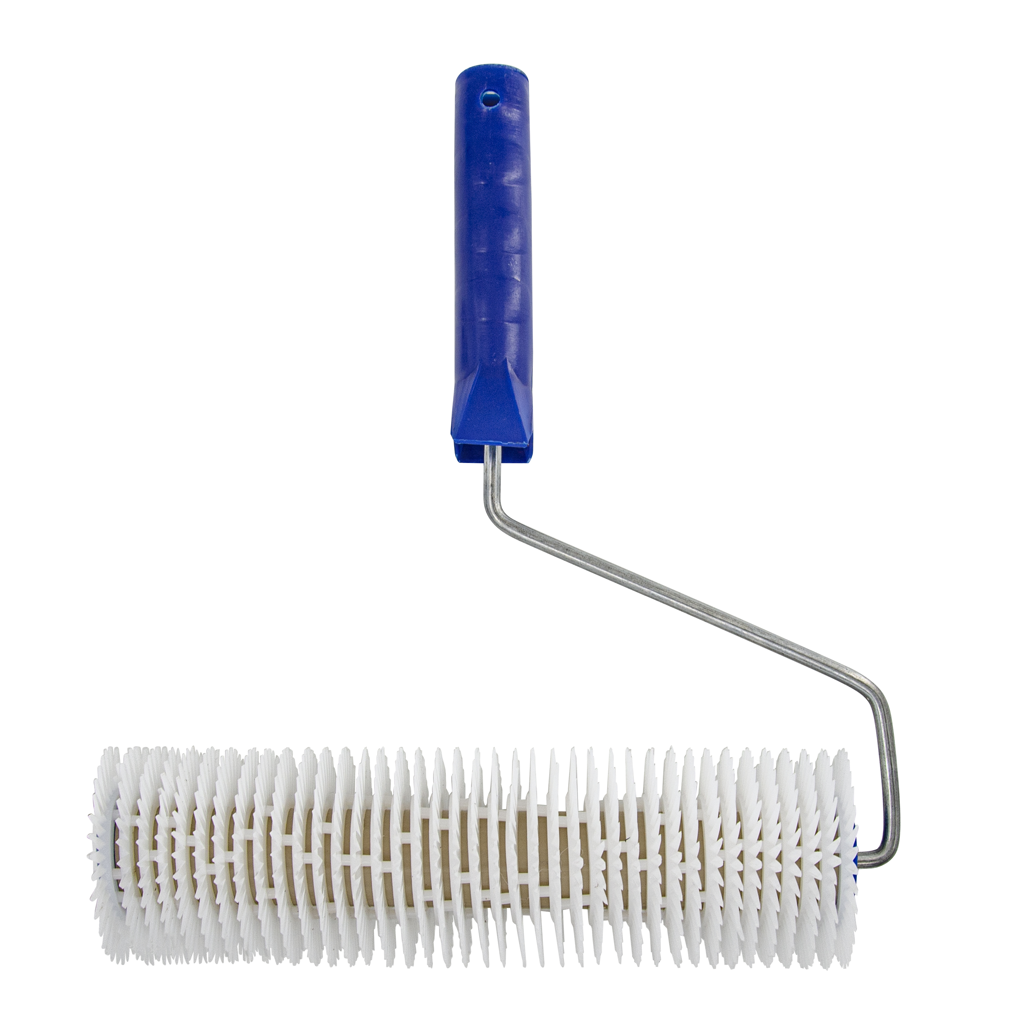 Валик игольчатый шириной рабочей поверхности 240 мм с малой острой иглой из ПНД, с длиной иглы 14 мм и диаметром ролика 72 мм. Каркас ролика-полиэтиленовая труба, крепление ролика шайба/шплинт. Бюгель изготовлен из оцинкованной стальной проволоки диаметром 6 мм с ручкой из первичного полиэтилена. Валик применяется для укладки ровного полимерного или бетонного пола с толщиной слоя до 13 мм. Главным предназначением валика с шипами является равномерное прокатывание жидкой смеси по поверхности, нуждающейся в выравнивании. Такая манипуляция позволяет убрать из строительного состава все лишнее, даже самые крохотные пузырьки воздуха.
