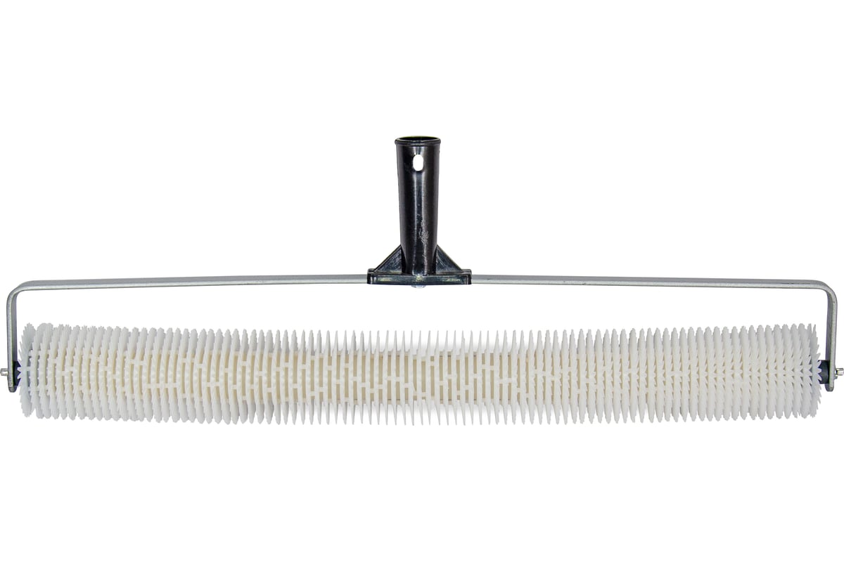 Валик шириной рабочей поверхности 600 мм. с малой острой иглой из ПНД, с длиной иглы 14 мм. и диаметром ролика 72 мм. Каркас ролика-полиэтиленовая труба, крепление ролика шайба/шплинт. Скоба валика изготовлена из окрашеной стальной полосы шириной 20 мм с ручкой из первичного полиэтилена. Валик применяется для укладки ровного полимерного или бетонного пола с толщиной слоя до 13 мм.