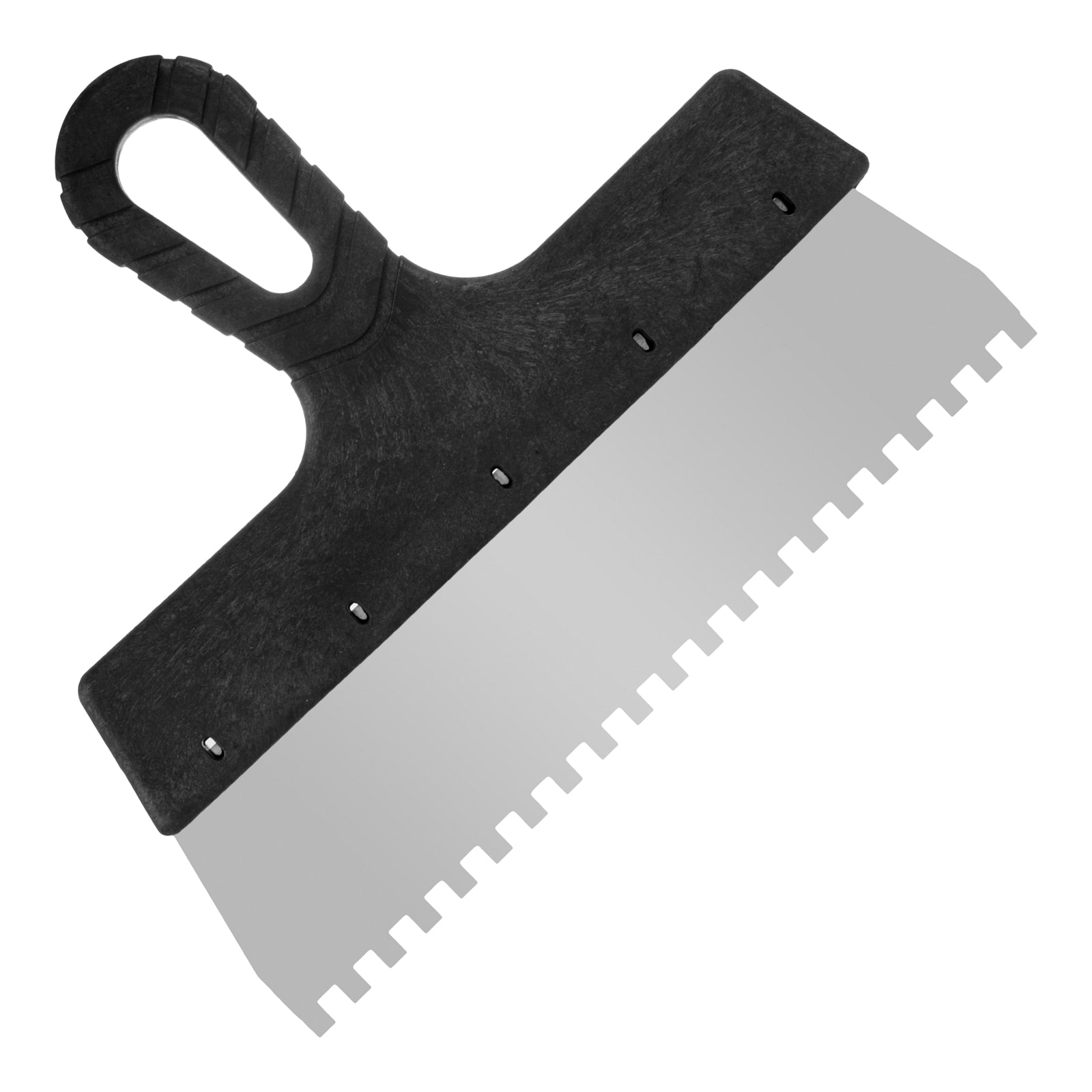 Фасадный зубчатый шпатель (250 мм, зуб 8x8 мм) предназначен для нанесения цементной смеси на поверхность во время укладки плитки. Лезвие выполнено из стали толщиной - 0.45 мм.