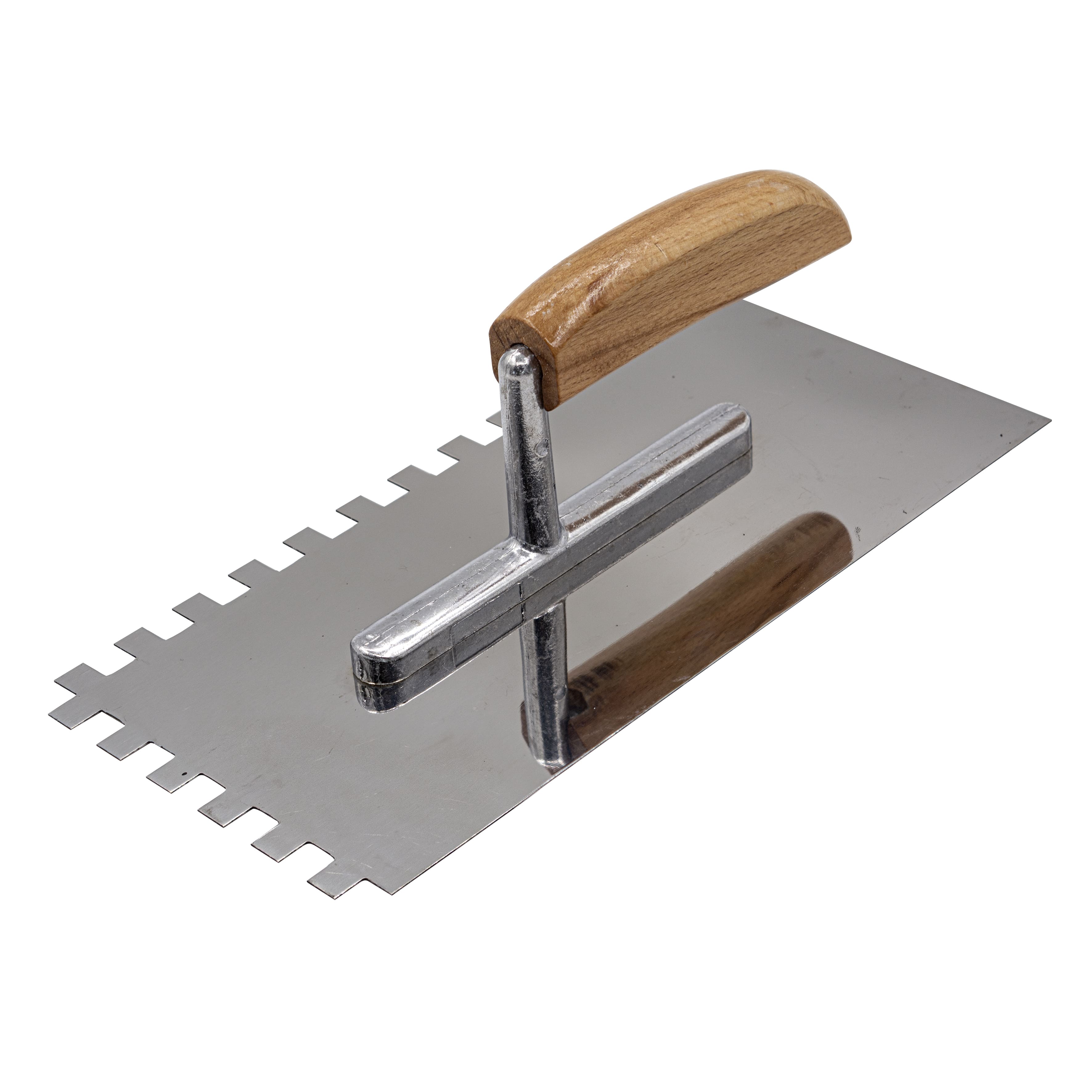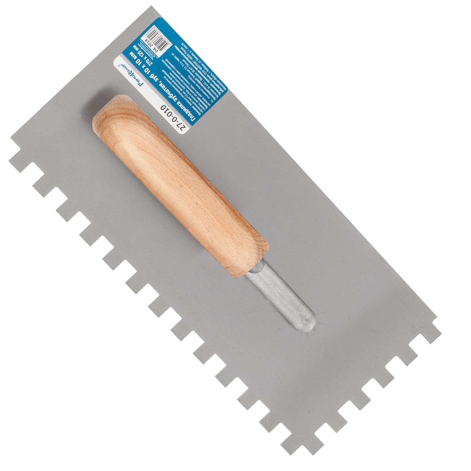 Зубчатая стальная гладилка Remocolor 27-0-010 рукоятка из бука 270х125 мм зуб 10х10 мм - применяется для равномерного распределения строительных растворов, смесей и клеев, сглаживания швов и неровностей. Рабочая поверхность изготовлена из зеркально отполированного полотна нержавеющей стали.