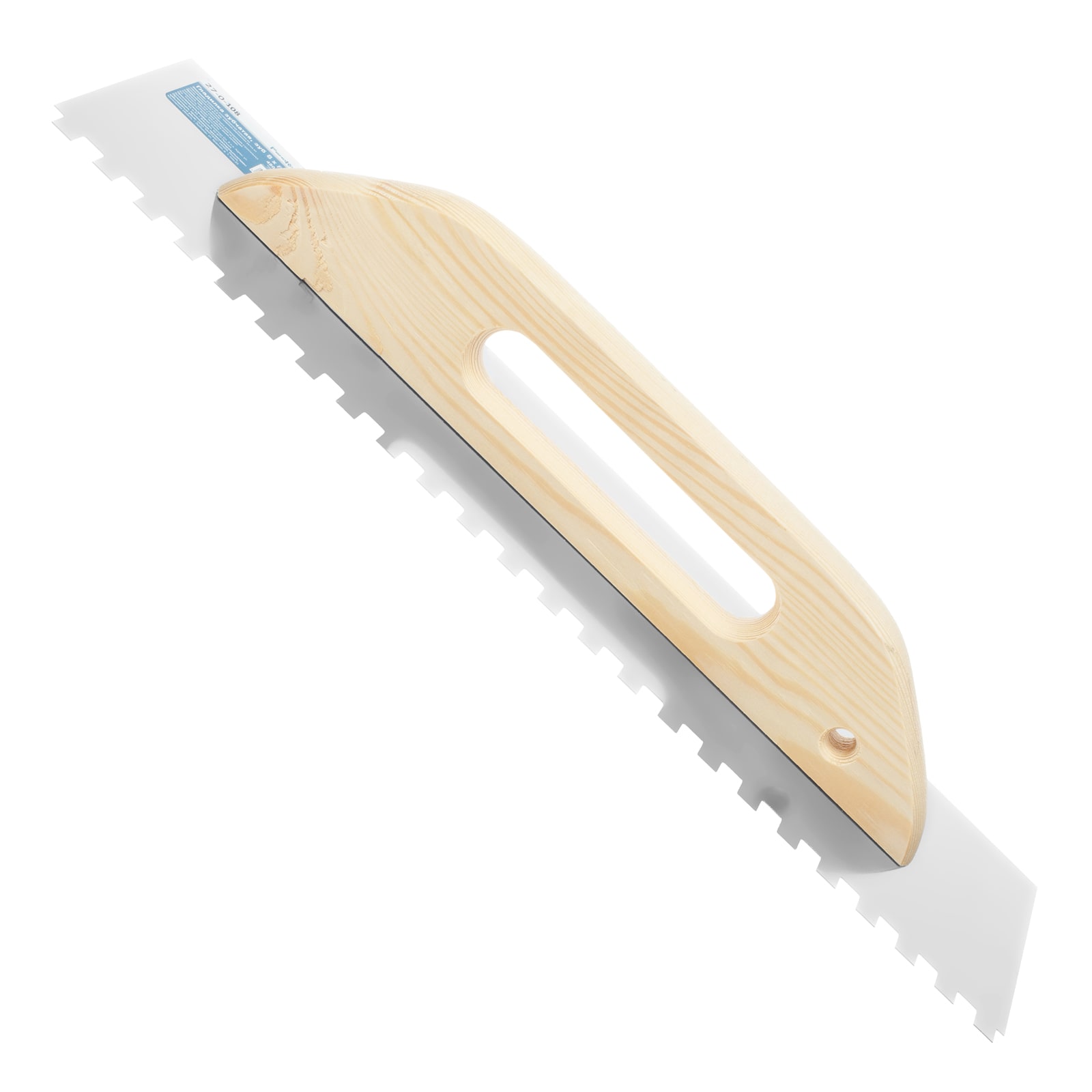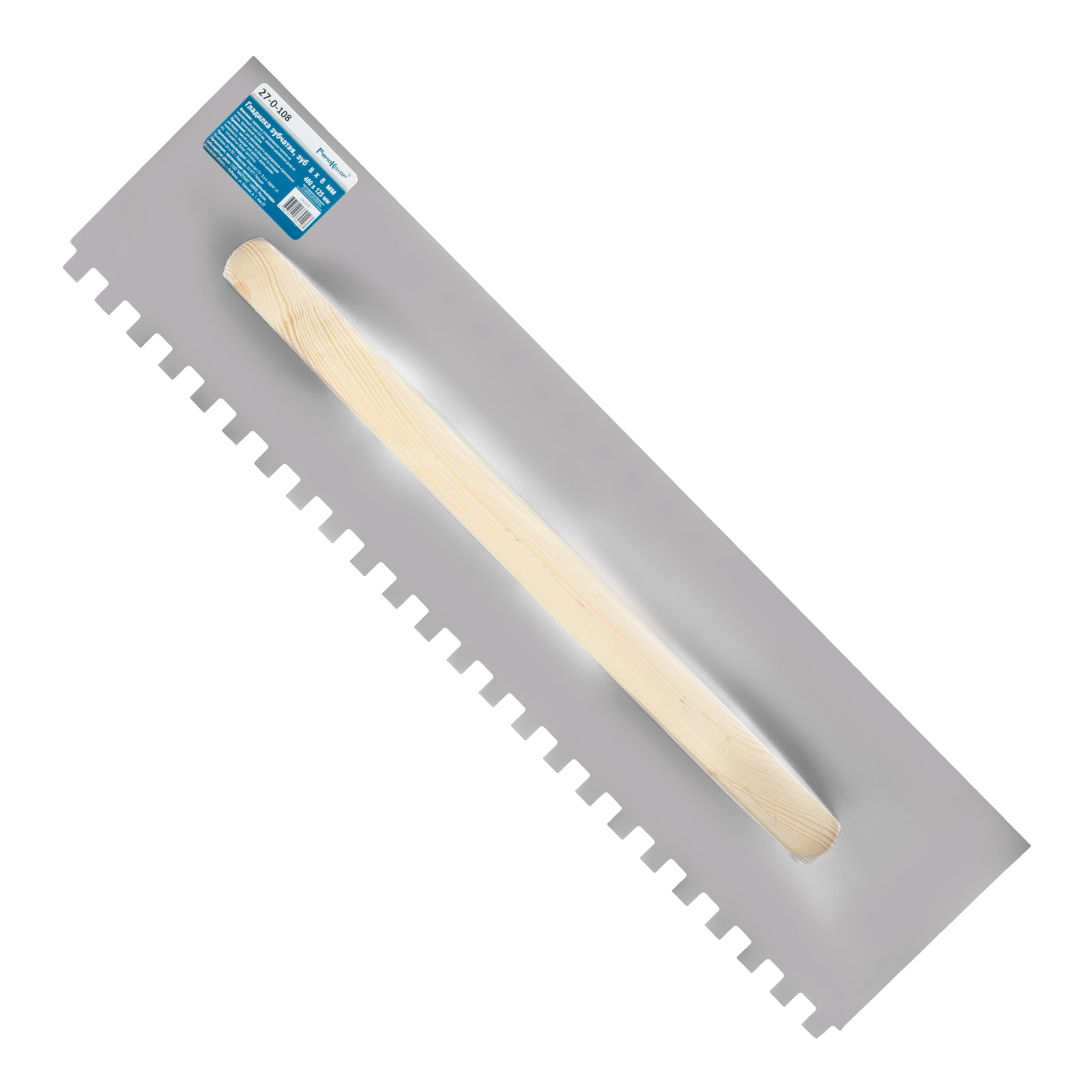 Нержавеющая гладилка РемоКолор зуб 8х8 мм 27-0-108 представляет собой инструмент, который используется для нанесения и разглаживания строительных составов, а также для выравнивания полов. Его конструкция состоит из полотна, выполненного из нержавеющей стали, и удобной деревянной рукоятки.
