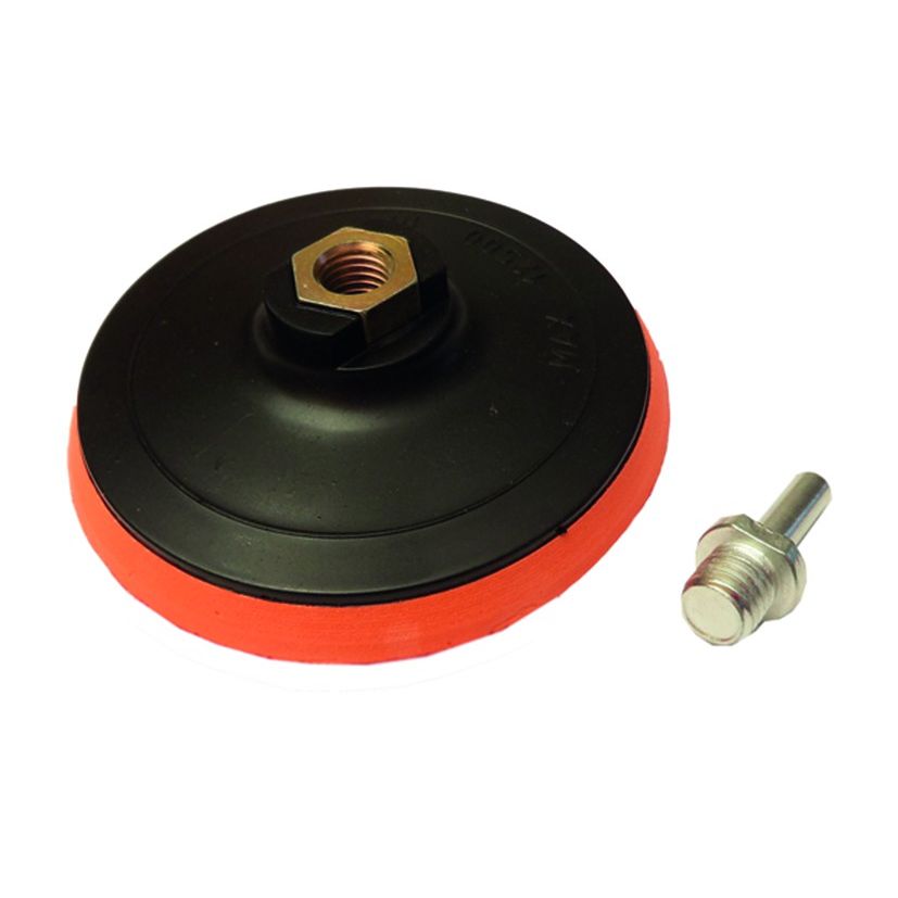 Применяется как съемная насадка-переходник для шлифовальных, полировальных машин и дрелей. Служит основанием для закрепления абразивных шлифовальных кругов диаметром 125 мм с помощью липучки. Комплектуется переходником для дрели с гайкой М14 на хвостовике. Материал: пластик, резина, сталь.