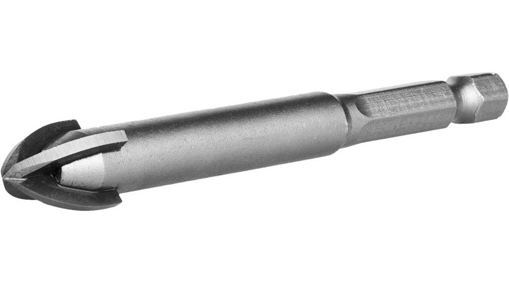 Шестигранный хвостовик. Имеет твердосплавную напайку с 4 режущими гранями из карбид-вольфрамового сплава. Для работ с керамической плиткой, облицовочным камнем и керамогранитом 6-10 классами твердости по Моссу. Наилучшие результаты сверления достигаются при низкой скорости вращения, достаточном охлаждении водой.