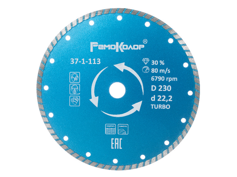 Диск алмазный РемоКолор professional TURBO 230х22,2 мм 37-1-113 - алмазный диск для широкого спектра действия. Применяется для сухого реза кирпича, бетона, натурального и искусственного камня. Способен разрезать тонкую арматуру в бетоне. Высокая скорость резания. 30% алмазной крошки в составе связки. Высота сегмента - 7 мм. Посадка 22,2 мм. Переходное кольцо в комплекте. Сухой рез. Охлаждение водой увеличивает ресурс диска.\