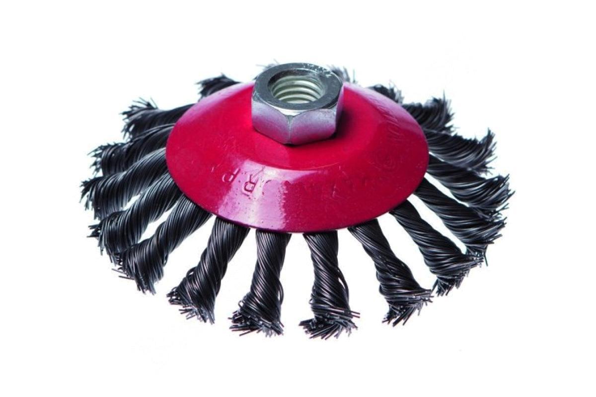 Рабочая часть из стальной скрученной проволоки толщиной 0.5 мм. Присоединительная гайка для УШМ с резьбой М14. Применяется для грубой очистки металлических поверхностей от ржавчины, грязи, удаления лакокрасочных покрытий и зачистки сварных швов.