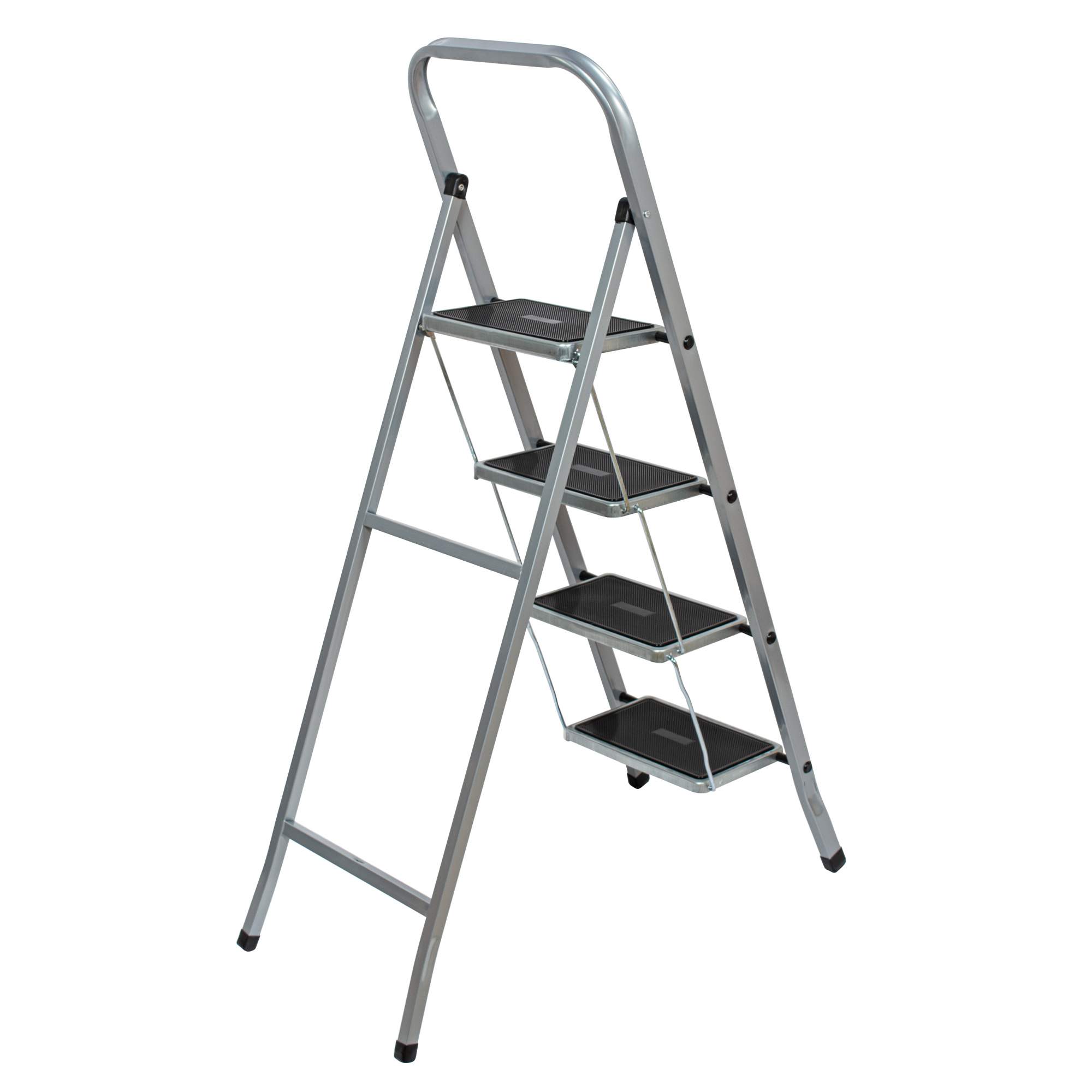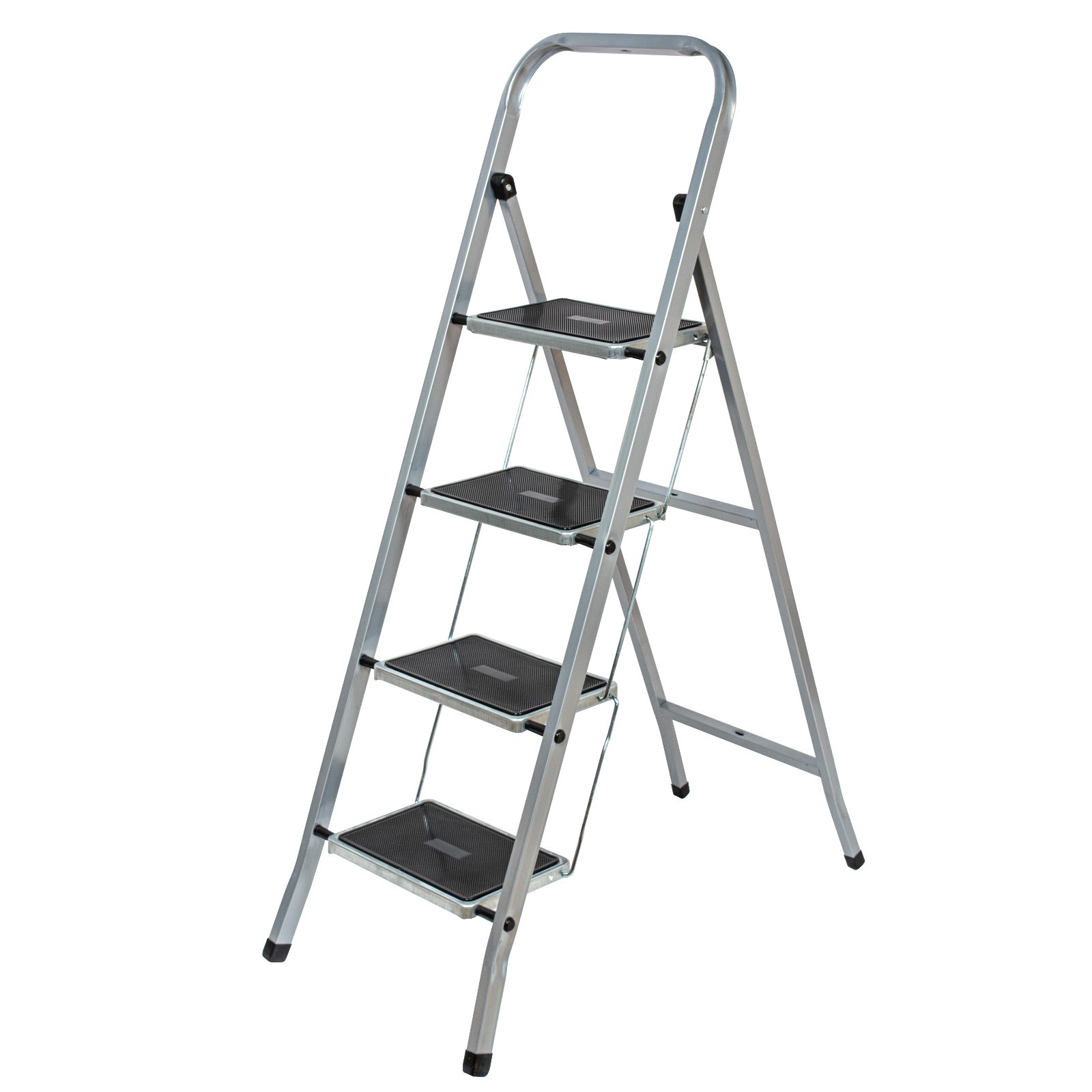 Изготовлена из качественной высокопрочной стали. Порошково-полимерное антикоррозийное покрытие надежно защищает от ржавчины. Широкие ступени с противоскользящими ковриками обеспечивают дополнительную устойчивость и безопасность при работе. Защитные пластиковые наконечники на ножках препятствуют проскальзыванию и предохраняют пол от повреждений. Благодаря компактному размеру стремянку удобно хранить и перевозить.
