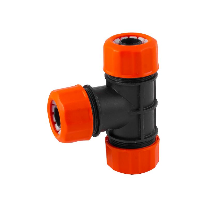 Тройник цанговый "ЖУК", 1/2" - 1/2" - 3/4", Ремоколор 64-1-024- Применяется для подключения одновременно двух водопроводных линий, со всех сторон тройника штуцер. Корпус пластиковый. Для закрепления шланга используется цанговое соединение - самое надёжное соединение, исключается подкапывание в месте соединения даже при сильном напоре. Шланг надевается на внутренний штуцер, при затягивании внешней гайки "лепестки"цанги смыкаются, и шланг диаметром 1/2, 3/4 надёжно фиксируется.