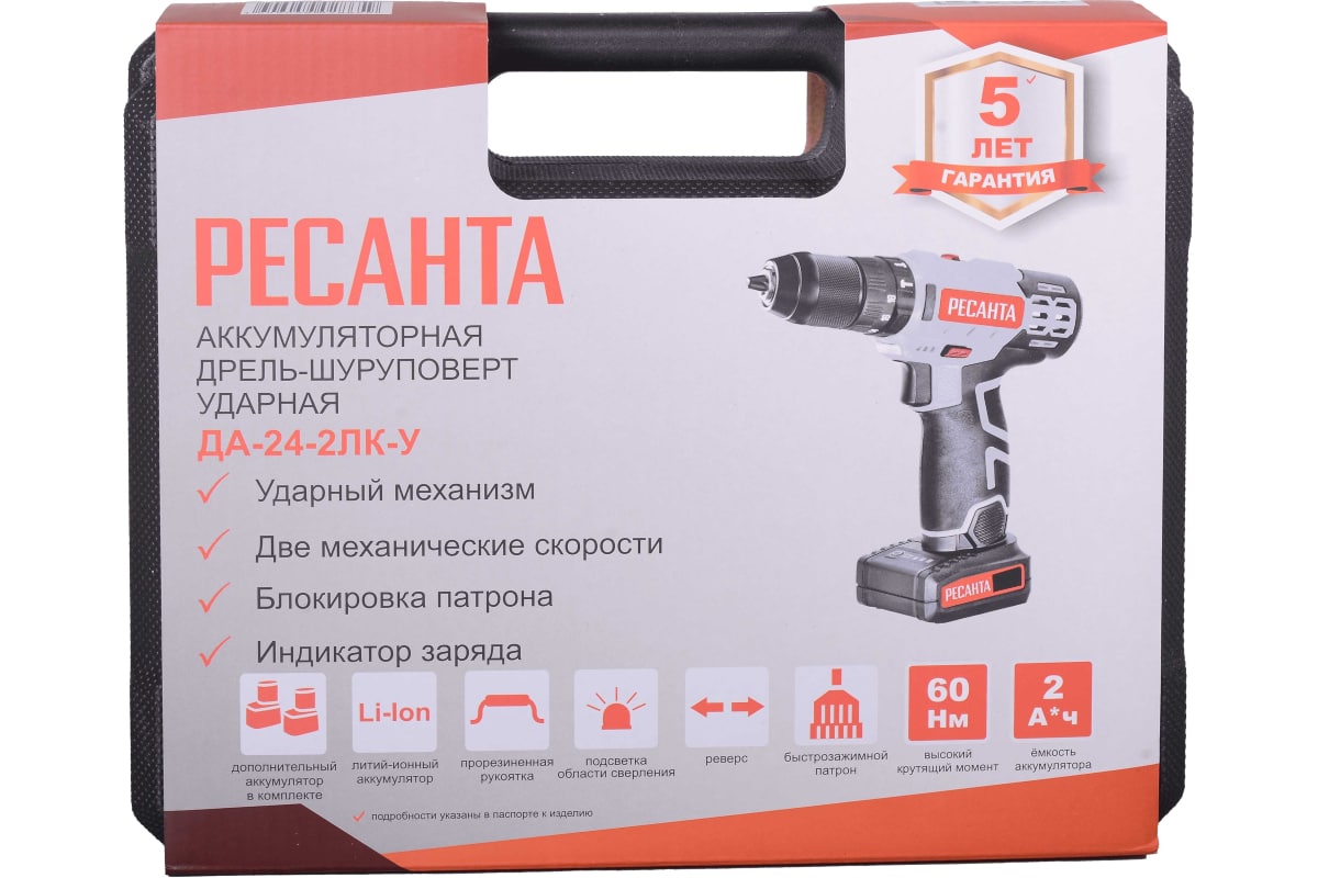 Дрель-шуруповерт аккумуляторная ДА-24-2ЛК-У Ресанта является усовершенствованной версией модели ДА-24Л-2К с дополнительной функцией долбления со сверлением. Используется для просверливания отверстий в деревянных, пластмассовых и металлических изделиях или для работы в качестве шуруповерт. Модель оснащена 2 аккумуляторами и кейсом, незаменима для людей, постоянно использующих дрели-шуруповерты в быту.Прорезиненная рукоять обеспечивает удобное и надёжное удержание инструмента в руке во время работы. Быстрозажимной патрон облегчает замену рабочей оснастки. Двухскоростной редуктор для удобства ведения различных работ. Реверсивный механизм предназначен для быстрого изъятия сверла из материала в случае застревания, выкручивания или ослабления крепежа. С помощью регулировки частоты вращения инструмент можно настроить под необходимую толщину материала. Модель работает от надёжного литий-ионного аккумулятора (Li-Ion).