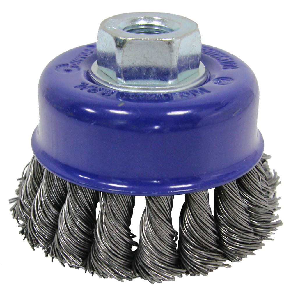 Щетка по металлу для углошлифовальной машины, металлическая, тип чашеобразный. Предназначена для обработки больших плоскостей. Форма «Чашка» обеспечивает хорошую площадь прилегания к поверхности. Конструкция щетки оснащена усиленной гайкой с шайбой (кроме D65), которая способствует предотвращению деформации изделия. Идеальная балансировка щеток значительно продлевает срок службы инструмента.