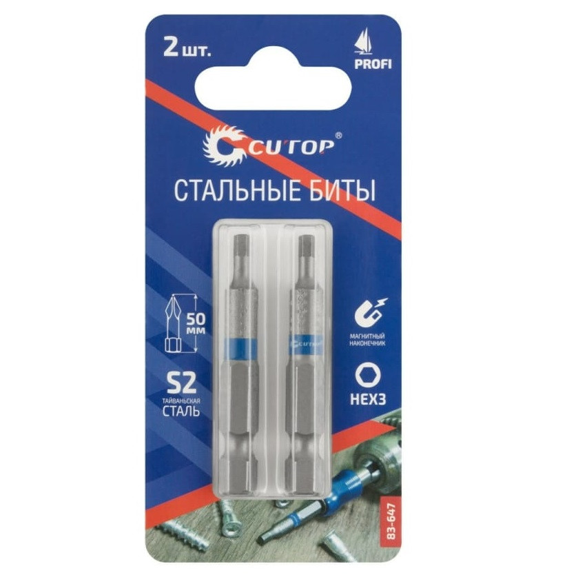 Биты стальные Profi 2 шт, HEX3, 50 мм CUTOP 83-647 предназначены для работы с шуруповертами при монтаже/демонтаже крепежа. Ресурс биты от 2000 шт саморезов. Биты изготавливаются из тайваньской стали высшего качества марки S2. Ребра биты производятся с помощью холодной штамповки в соответствии с точной спецификацией. Кончик проходит специальный процесс закалки при температурах до 870°C. Результатом является насадка с твердостью 60 HRC с высоким сроком службы. Намагниченный шлиц. Высокая точность.
