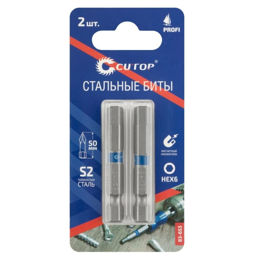 Биты стальные Profi 2 шт, HEX6, 50 мм CUTOP 83-653 предназначены для работы с шуруповертами при монтаже/демонтаже крепежа. Ресурс биты от 2000 шт саморезов.Биты изготавливаются из тайваньской стали высшего качества марки S2. Ребра биты производятся с помощью холодной штамповки в соответствии с точной спецификацией. Кончик проходит специальный процесс закалки при температурах до 870°C. Результатом является насадка с твердостью 60 HRC с высоким сроком службы. Намагниченный шлиц. Высокая точность.