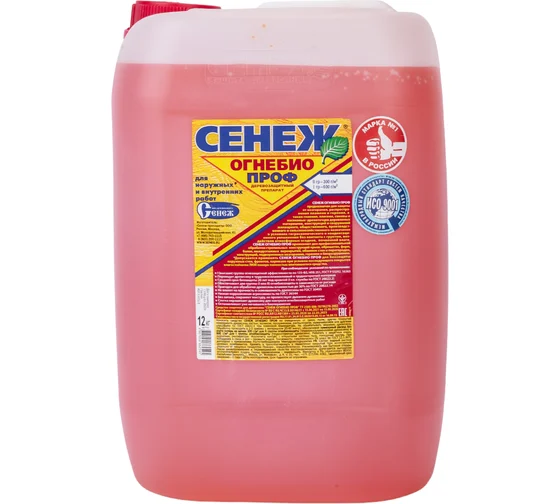 Огнебиозащита для древесины СЕНЕЖ ОГНЕБИО ПРОФ предназначена для комплексной защиты древесины от горения, воспламенения, распространения пламени, гниения, плесени, синевы и насекомых-древоточцев внутри помещений и на открытом воздухе (под навесом) в условиях гигроскопического и конденсационного увлажнения без контакта с грунтом, воздействия атмосферных осадков, почвенной влаги. Преимущества: - I (высшая) группа огнезащитной эффективности по 123-ФЗ, НПБ 251, ГОСТ Р 53292, ГОСТ 16363. - II (типовая) группа огнезащиты при вдвое меньшем расходе. - Универсален, обеспечивает две группы огнезащиты одним материалом. - Переводит древесину в трудногорючий, трудновоспламеняемый материал. - Немного окрашивает древесину для ускорения контроля качества работ. - Сохраняет текстуру, не препятствует дыханию древесины. - Не ухудшает прочностные характеристики обработанной древесины. -Останавливает уже начавшееся биопоражение. - Пожаро-, взрыво- безопасный материал, не имеет запаха.