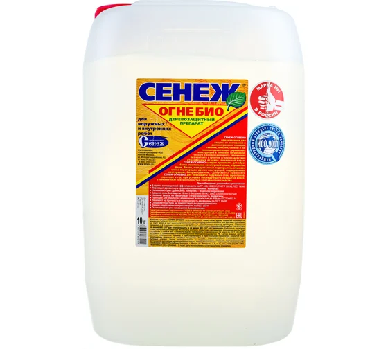 Огнебиозащита для древесины СЕНЕЖ ОГНЕБИО ПРОФ предназначена для комплексной защиты древесины от горения, воспламенения, распространения пламени, гниения, плесени, синевы и насекомых-древоточцев внутри помещений и на открытом воздухе (под навесом) в условиях гигроскопического и конденсационного увлажнения без контакта с грунтом, воздействия атмосферных осадков, почвенной влаги. Преимущества: - I (высшая) группа огнезащитной эффективности по 123-ФЗ, НПБ 251, ГОСТ Р 53292, ГОСТ 16363. - II (типовая) группа огнезащиты при вдвое меньшем расходе. - Универсален, обеспечивает две группы огнезащиты одним материалом. - Переводит древесину в трудногорючий, трудновоспламеняемый материал. - Немного окрашивает древесину для ускорения контроля качества работ. - Сохраняет текстуру, не препятствует дыханию древесины. - Не ухудшает прочностные характеристики обработанной древесины. -Останавливает уже начавшееся биопоражение. - Пожаро-, взрыво- безопасный материал, не имеет запаха.
