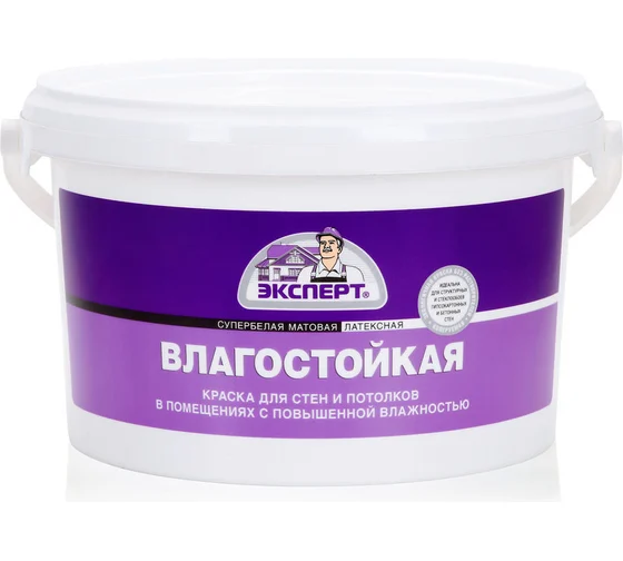Краска ЭКСПЕРТ влагостойкая, супербелая, применяется для окраски стен и потолков внутри сухих и влажных помещений. Состав наносят на бетонные и оштукатуренные поверхности, гипсовые и гипсокартонные плиты, структурные и стеклообои. Продукт обладает высокой степенью белизны и укрывистости, хорошей стойкостью к влажности. Выдерживает легкую влажную уборку. Ручная колеровка акриловыми колорантами или пигментами для красок на водной основе, позволяет получить любой желаемый оттенок.