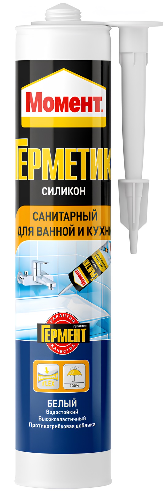 Санитарный герметик для ванной и кухни Момент белый, 280 мл белого цвета имеет силиконовую основу и небольшой запах уксусной кислоты. Устойчив к воздействию УФ лучей и применяется для герметизации кухни, ванных комнат, бань, душевых. Можно использовать как для внутренних, так и внешних работ. Такой герметик не окрашивает склеиваемые детали. Не рекомендуется применять на металлических поверхностях, подверженных коррозии, на бетонных, оштукатуренных и цементных поверхностях, для аквариумов, зеркал и на природных камнях. Данный герметик необходимо хранить в сухих помещениях с температурой от +5ºС до +30ºС. Дополнительные характеристики: Термостойкость от -40ºС до +150ºС; Температура нанесения от +5ºС до +40ºС; Время образования пленки — 15 минут; Скорость отвердевания — 2 мм/день; Срок годности — 18 месяцев.
