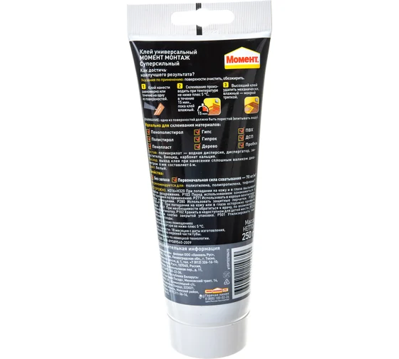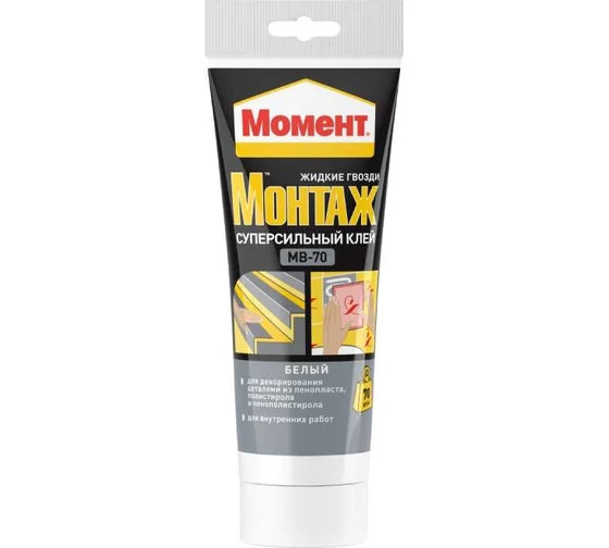 Монтажный клей МОМЕНТ 250 г, суперсильный Б0022980 1192821 - монтажный клей с повышенной прочностью крепления для склеивания изделий из гипсокартона, ПВХ, ДСП и других материалов. Повышенная прочность крепления. Первоначальная сила склеивания - 70кг/м² Открытое время - 15 минут Рекомендуется для использования внутри помещения. Склеивает большинство материалов, Клей на водной основе (одна из поверхностей должна быть пористой или впитывать влагу). Экологически чистый, без запаха. После отверждения клей возможно окрашивать. Склеивает такие материалы как дерево, металл, ПВХ, керамику, ДСП, МДФ, гипсокартон, пробку, полистирол, пенопласт, гипс и другие подобные материалы. Используется для приклеивания: - Стеновых панелей из дерева, ПВХ, пробки, гипсокартон - Изоляционных панелей, декоративных деталей, профилей - Установка подоконников и дверных рам - Приклеивания плинтусов и декоративных фризов