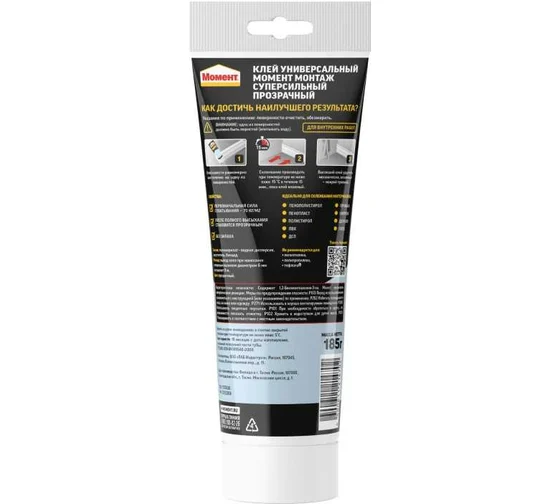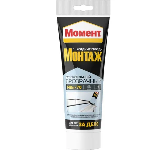 Монтажный клей МОМЕНТ Монтаж Суперсильный Прозрачный отличается высокой первоначальной силой склеивания (70 кг/м2), влаго- и морозостойкостью. Продукт используется во время различных ремонтных работ.
