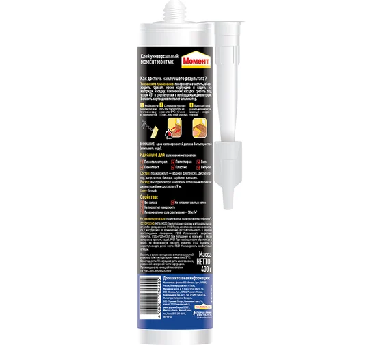 Клей МОНТАЖ экспресс Момент используется, когда необходимо прочное склеивание. Применяют при установке подоконников и дверных рам, облицовочной плитки, настенных табличек, различных профилей, изоляционных панелей, плинтусов и декоративных фризов. Данный клей не содержит растворителей и не имеет запаха. Хранить его необходимо при температуре не ниже 0 ºС. Соединяемые поверхности должны быть обезжиренными, и одна из них должна впитывать клей. Склеивание осуществляется при температуре от 10 ºС, в течение 15 минут. Если склеиваются жесткие материалы, то поверхности необходимо зафиксировать от 8 до 24 часов. Не подходит для склеивания полиэтилена, полипропилена, тефлона и аналогичных материалов. Склеиваемые материалы: стиропор, дерево, металл, ПВХ, керамика, ДСП, гипсокартон, пробка, пенополистирол, гипс. Срок годности — 18 месяцев. Первоначальная сила схватывания — 50 кг/м2.