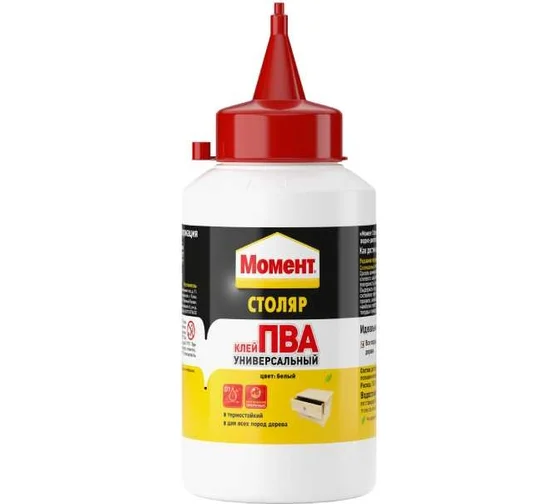 Универсальный клей Момент Столяр ПВА 250 г 1960505 на основе водной дисперсии ПВА, подходящий для всех пород дерева. Высокая прочность склеивания. Не окрашивает дерево. Термостойкий. Прозрачный шов после высыхания. Предназначен для склеивания всех пород дерева, ДСП, ДВП, МДФ, многослойной фанеры, декоративного бумажно - слоистого пластика и шпона.
