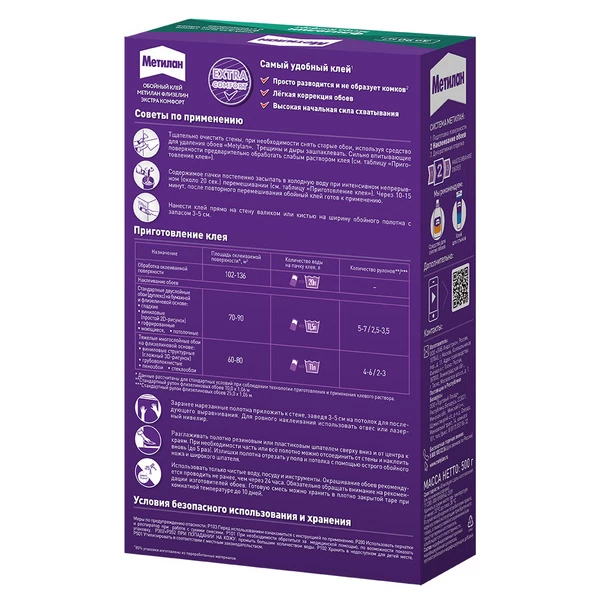 Инструкция по применению Содержимое пачки постепенно засыпать в холодную воду при интенсивном непрерывном (около 20 секунд) перемешивании. Также возможно добавление воды к сухому клею при интенсивном перемешивании. Через 3-5 минут после повторного перемешивания обойный клей готов к применению. Пока готовится клей, нарезать рулон обоев на полотна необходимой длины (высота стены + 3-5 см сверху и снизу) Нанести клей прямо на стену валиком или щёткой на ширину обойного полотна плюс 3-5 см. Нанесение клея легко контролируется благодаря розовому индикатору. Приложить полотно обоев к стене, заведя 3-5 см на потолок для последующего выравнивания. Для ровного наклеивания использовать отвес или лазерный нивелир. Разглаживать полотно резиновым или пластиковым шпателем сверху вниз и от центра к краям для удаления пузырей воздуха и излишков клея. При необходимости часть или всё полотно можно отсоединить от стены и наклеить вновь (до 5 раз) Излишки полотна отрезать у пола и потолка с помощью острого обойного ножа