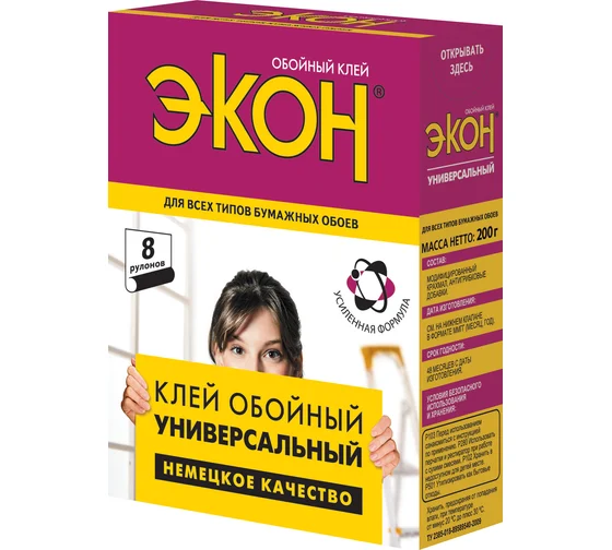 Предназначен для всех видов бумажных обоев гладких, структурных, гофрированных, дуплекс, тяжелых. Клей имеет новую усиленную формулу, прост в приготовлении, не оставляет следов на обоях