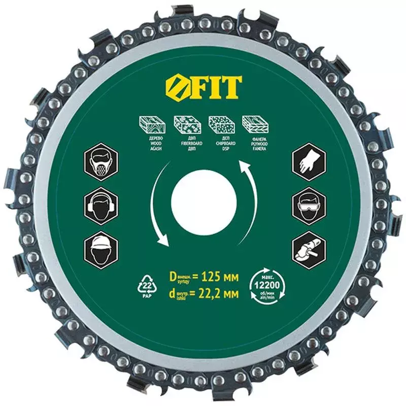 Диск отрезной цепной 125х22.2 мм, толщина реза 6 мм FIT 37649 предназначен для резки, фрезерования, профилирования, рифления, нарезки и выборки пазов в дереве, фанере, ДВП и ДСП с помощью угловой шлифовальной машины.
