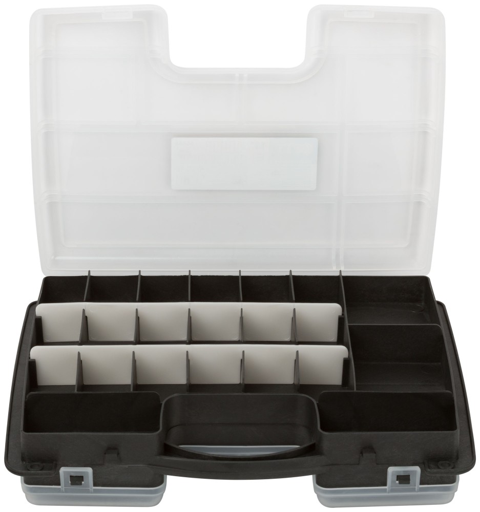 Двусторонний ящик-органайзер FIT 65646 выполнен в форме кейса, служит для хранения и переноски крепежных изделий. Имеет 22 отделения с одной стороны и 10 с другой, где удобно размещаются необходимые аксессуары и различные мелочи. С помощью переставных перегородок можно регулировать размеры ячеек, чтобы максимально эффективно использовать имеющееся внутри пространство. Прозрачная крышка позволяет видеть расположение крепежа внутри. Две пластиковые защелки надежно защищают чемоданчик от непреднамеренного открывания.