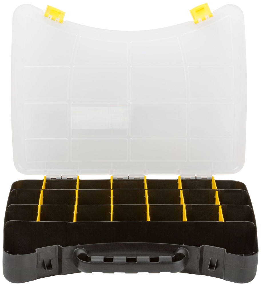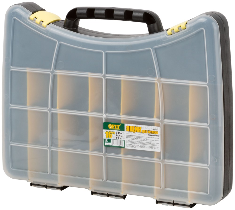 Пластиковый ящик FIT 65652 выполнен в форме кейса, служит для хранения и переноски крепежных изделий. Состоит из 22 отделений, где удобно размещаются необходимые аксессуары и различные мелочи. С помощью переставных перегородок можно регулировать размеры ячеек, чтобы максимально эффективно использовать имеющееся внутри пространство. Прозрачная крышка позволяет видеть расположение крепежа внутри. Две пластиковые защелки надежно защищают чемоданчик от непреднамеренного открывания.