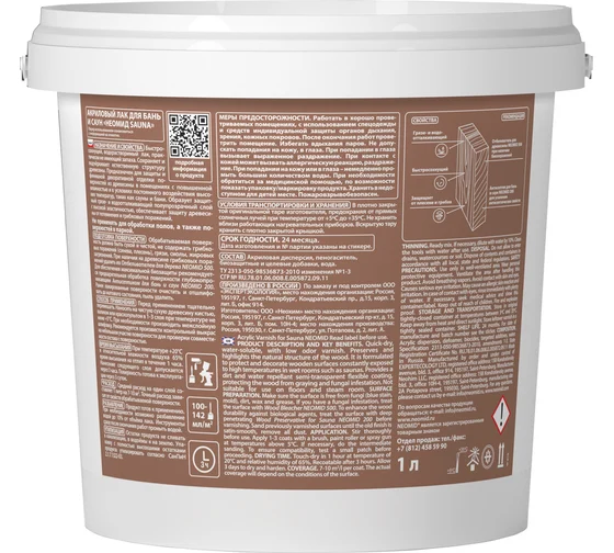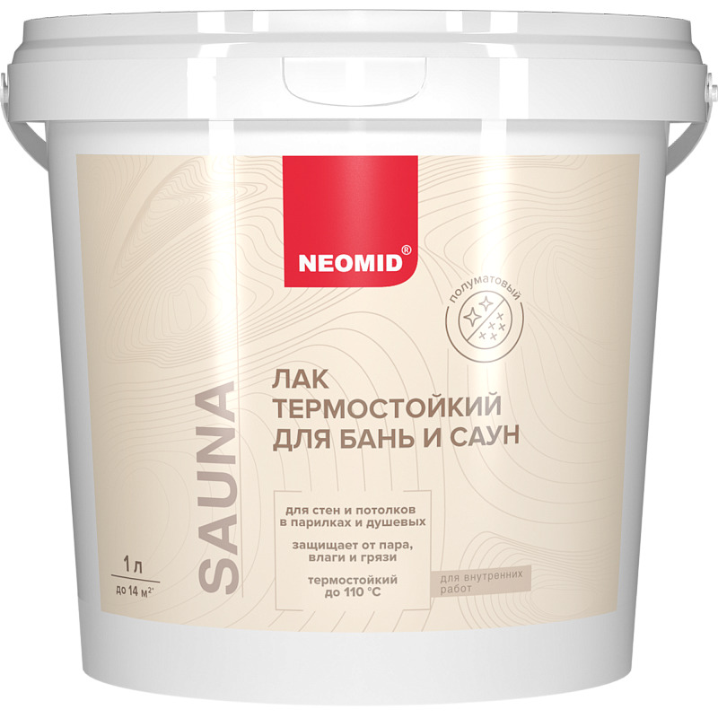 Деревозащитный лак на акриловой основе. Быстросохнущий, водорастворимый, практически не имеет запаха, после высыхания сохраняется натуральный запах древесины. Сохраняет и подчёркивает естественную структуру древесины. Предназначен для защиты и финишной декоративной отделки поверхности древесины в помещениях с повышенной влажностью и в условиях постоянного воздействия высоких температур, таких как сауны и бани. Образует защитный грязе – и водоотталкивающий полупрозрачный слой с высокой эластичностью, обеспечивает защиту древесины от потемнения и грибковых поражений. Не применять для обработки полков и полов.