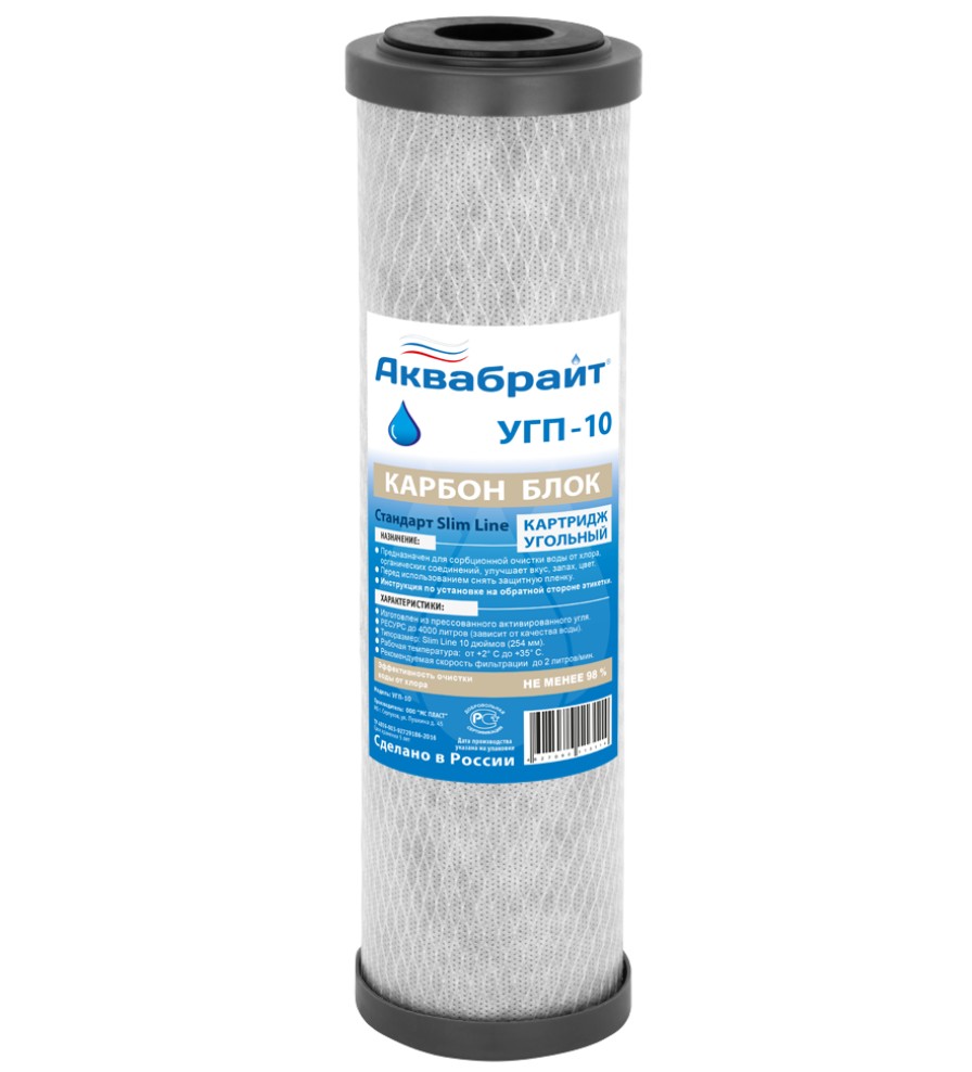 Картридж изготовлен из спеченного прессованного активированного угля с пищевым допуском. Предназначен для очистки воды от хлора, органики и микроорганизмов. Рекомендуется для предварительной очистки воды. Технические характеристики: Типоразмер Slim Line 10 дюймов (h - 254 мм ± 1 мм); Рабочая температура от +2° до +35° С; Рекомендуемая скорость фильтрации до 2 л/мин; Ресурс до 4000 литров.