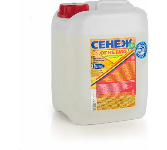 Огнебиозащита для древесины СЕНЕЖ ОГНЕБИО ПРОФ предназначена для комплексной защиты древесины от горения, воспламенения, распространения пламени, гниения, плесени, синевы и насекомых-древоточцев внутри помещений и на открытом воздухе (под навесом) в условиях гигроскопического и конденсационного увлажнения без контакта с грунтом, воздействия атмосферных осадков, почвенной влаги. Преимущества: - I (высшая) группа огнезащитной эффективности по 123-ФЗ, НПБ 251, ГОСТ Р 53292, ГОСТ 16363. - II (типовая) группа огнезащиты при вдвое меньшем расходе. - Универсален, обеспечивает две группы огнезащиты одним материалом. - Переводит древесину в трудногорючий, трудновоспламеняемый материал. - Немного окрашивает древесину для ускорения контроля качества работ. - Сохраняет текстуру, не препятствует дыханию древесины. - Не ухудшает прочностные характеристики обработанной древесины. -Останавливает уже начавшееся биопоражение. - Пожаро-, взрыво- безопасный материал, не имеет запаха.
