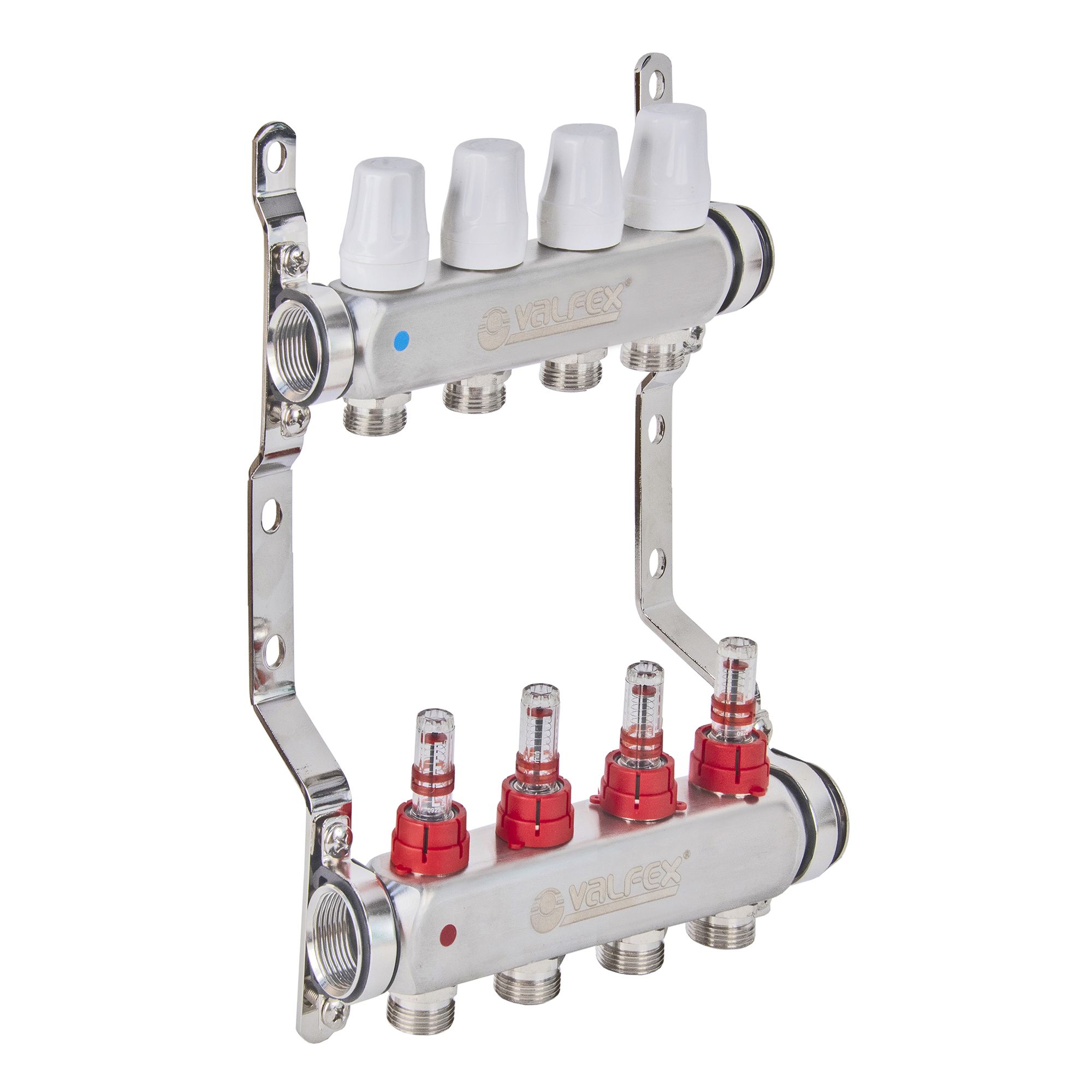 Блок коллекторов из нержавеющей стали с регулирующими клапанами и расходомерами ТМ VALFEX – позволяет производить балансировку петель с помощью настроечных клапанов с расходомерами при включенном циркуляционном насосе.